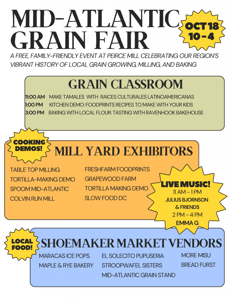 Learn about local grains at Washington’s last working grist mill. Organized by the Friends of Peirce Mill and the Common Grain Alliance, the Grain Fair brings farmers, millers, and bakers from across the region to Rock Creek Park for a day of cooking and milling demonstrations, hands-on activities, live music, and a vendor market filled with local, whole-grain foods!